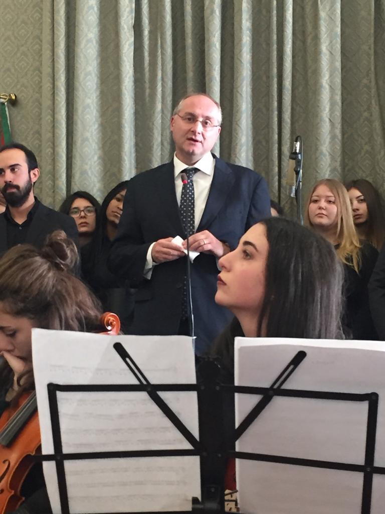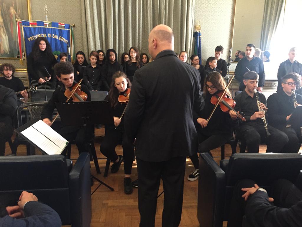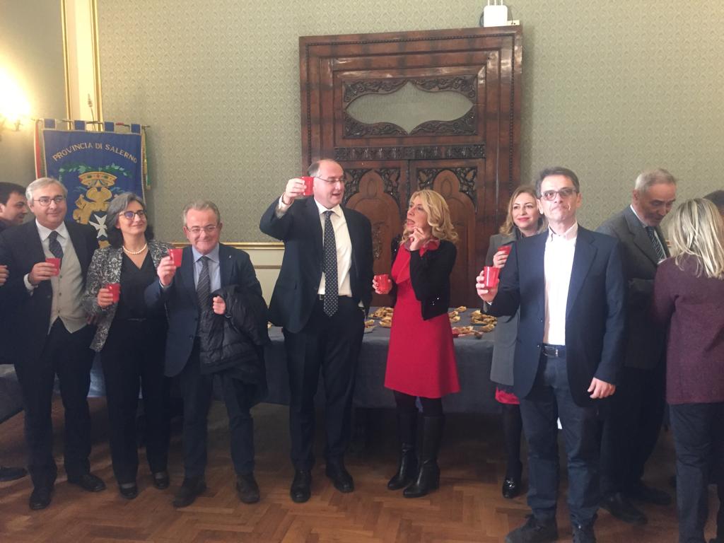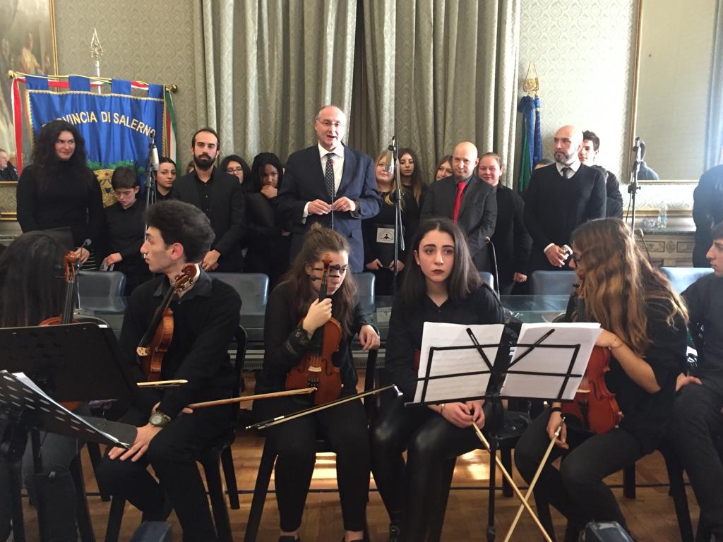 Oggi, venerdì 21 dicembre alle ore 11,30 nel salone Bottiglieri di Palazzo Sant'Agostino, il Presidente della Provincia, Michele Strianese, ha incontrato gli amministratori, i dirigenti e i dipendenti, sia dell'Ente che delle partecipate, per il consueto scambio di auguri per il Santo Natale e per il 2019. Per l’occasione gli allievi del Liceo Artistico, Classico e Musicale “Perito-Levi-Daniele” di Eboli hanno eseguito alcuni brani diretti dal Maestro coordinatore Giuseppe Del Plato e dai Maestri Gaetano Santucci e Piero Noschese.