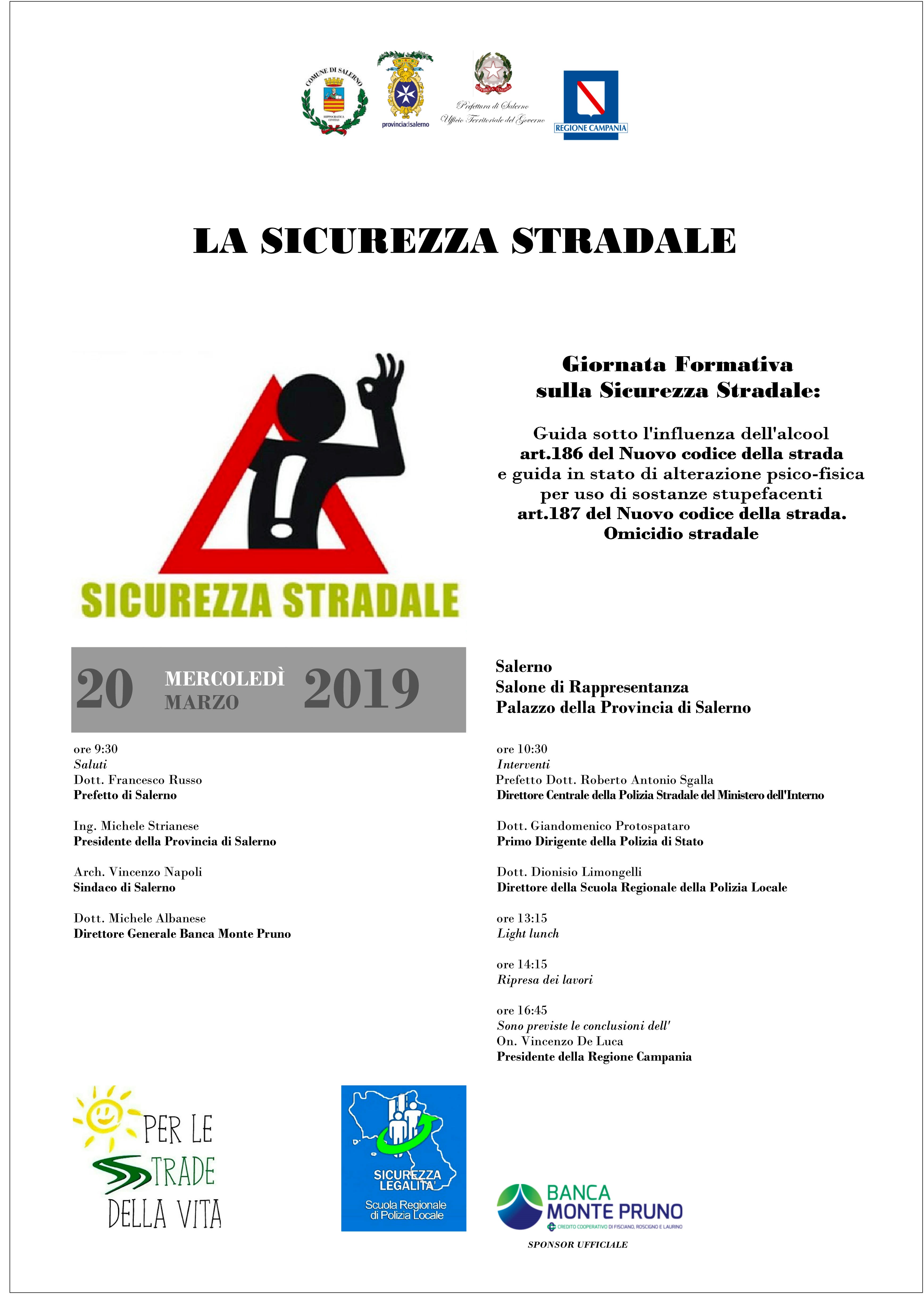 Mercoledì 20 marzo 2019, alle 9,30, presso il Salone di Rappresentanza del Palazzo della Provincia di Salerno, si tiene una giornata formativa sulla sicurezza stradale. L’incontro è organizzato nell’ambito della collaborazione istituzionale e nell’ottica di fornire utili strumenti di analisi e approfondimento, da Prefettura e Provincia di Salerno, d’intesa con la Regione Campania e il Comune di Salerno.