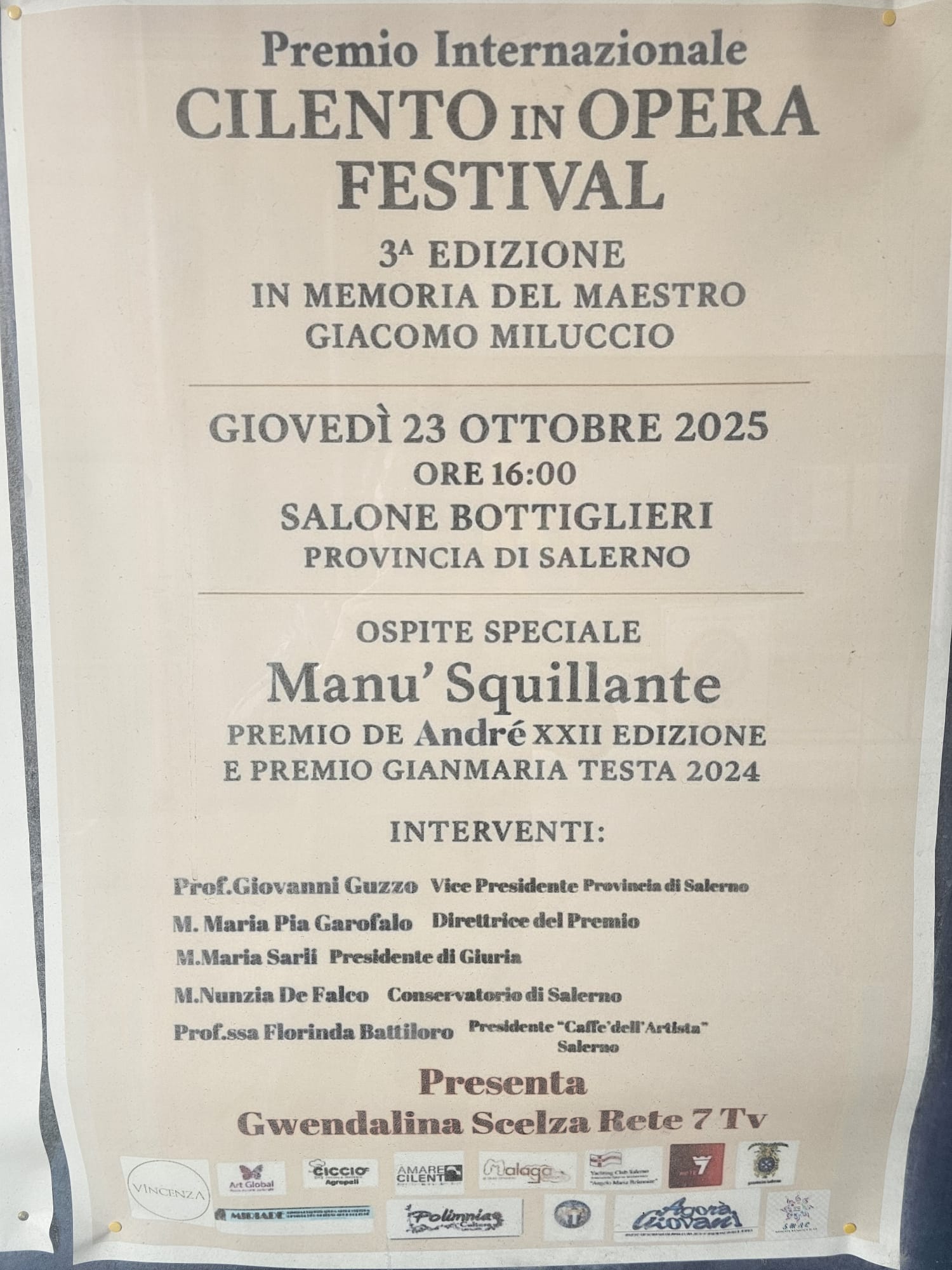 Domani, giovedì 23 ottobre, nel Salone Bottiglieri della Provincia di Salerno, a partire dalle 16:00, in programma la cerimonia di premiazione della III Edizione del Premio Internazionale del "Cilento in Opera Festival", intitolato alla memoria del M. Giacomo Miluccio.